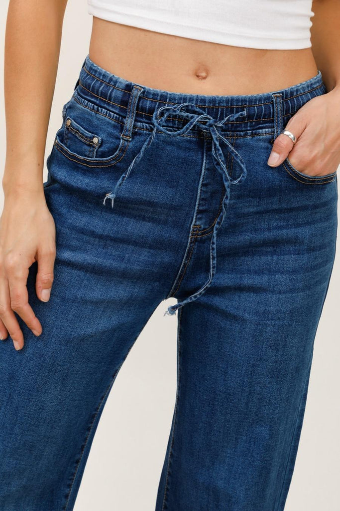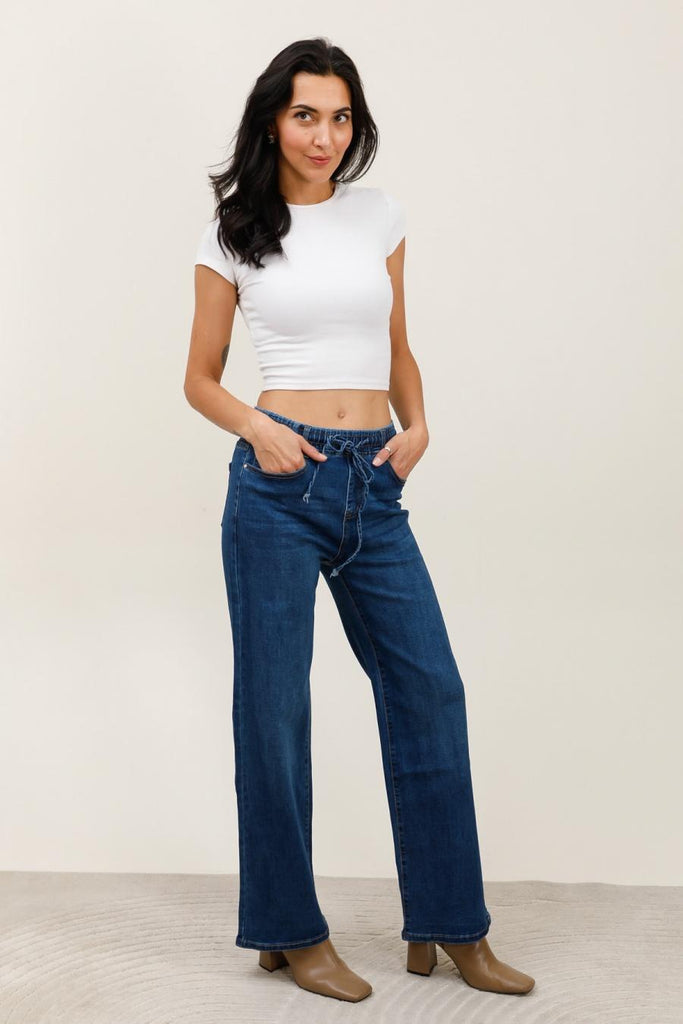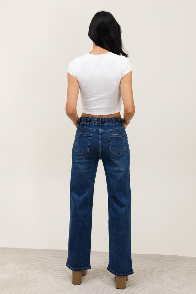 Jeans sans bouton, avec un élastique à la taille.