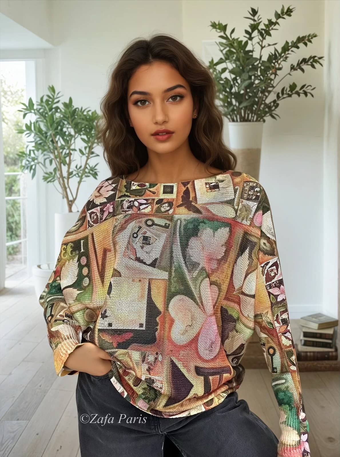 Pull en maille en col rond, manche longue chauve souris, imprimé